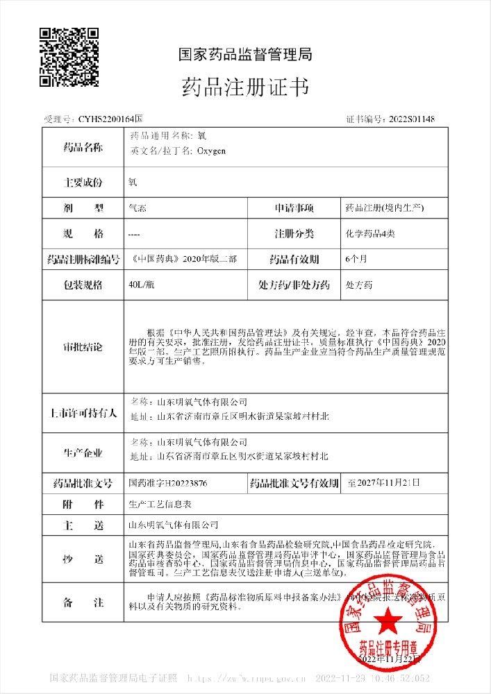 2022年12月取得國家藥品監(jiān)督管理局頒的藥品注冊證書,醫(yī)用氧項目正式投入生產(chǎn)
